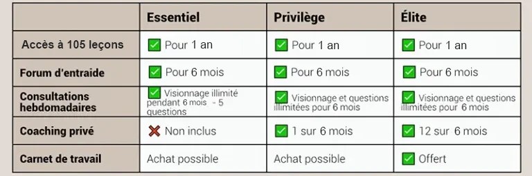 Enfin, passe Élite si tu as besoin d’être guidée et motivée de façon personnalisée tout au long des 4 mois. La plupart de nos membres élite n’ont pas nécessairement un chien plus difficile que les autres, mais le coaching hebdomadaire leur permet de rester à flot, avec un bilan très régulier, et une éducatrice dédiée pendant toute la durée de la formation.
